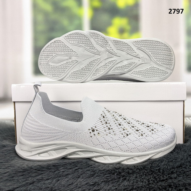 Кросівки без шнурків, легко одягаються, з квадратними стразами смужками. Підошва виконана зі спіненого ПВХ - дуже легка, гнучка, не просідає при тривалому використанні, має амортизаційні властивості. Завдяки текстильному матеріалу, нога добре провітрюється і не парить.