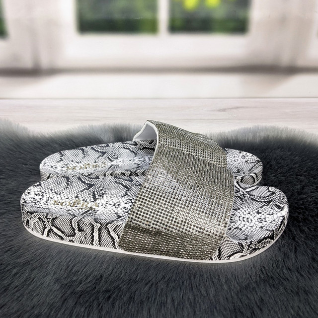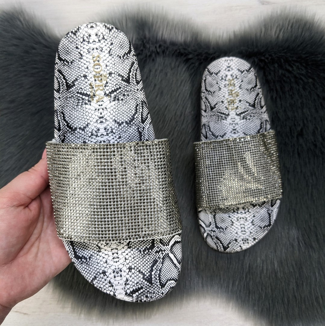 Дуже красиві, помітні та стильні шльопанці зі стразами. Класно виглядають на ніжках. Стрази красиво переливаються на сонці різними кольорами, із голографічним ефектом. На підошві стильний зміїний принт. Верх з м'якою тканинною підкладкою і тонким поролоновим прошарком.