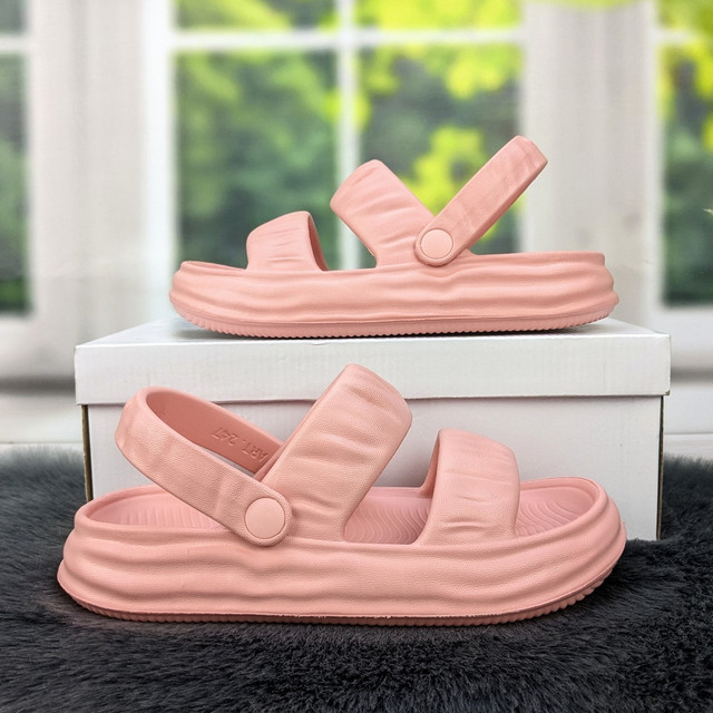 Класні легенькі сланці-сандалі на об'ємній підошві. Виготовлені з м'якої гнучкої піни (EVA). Висока об'ємна підошва добре амортизує під час ходьби, згладжуючи нерівності поверхні. Лямка на п'яті розтягується і добре фіксує ногу. Так само можна перекинути лямку на перед і носити просто як шльопанці.
